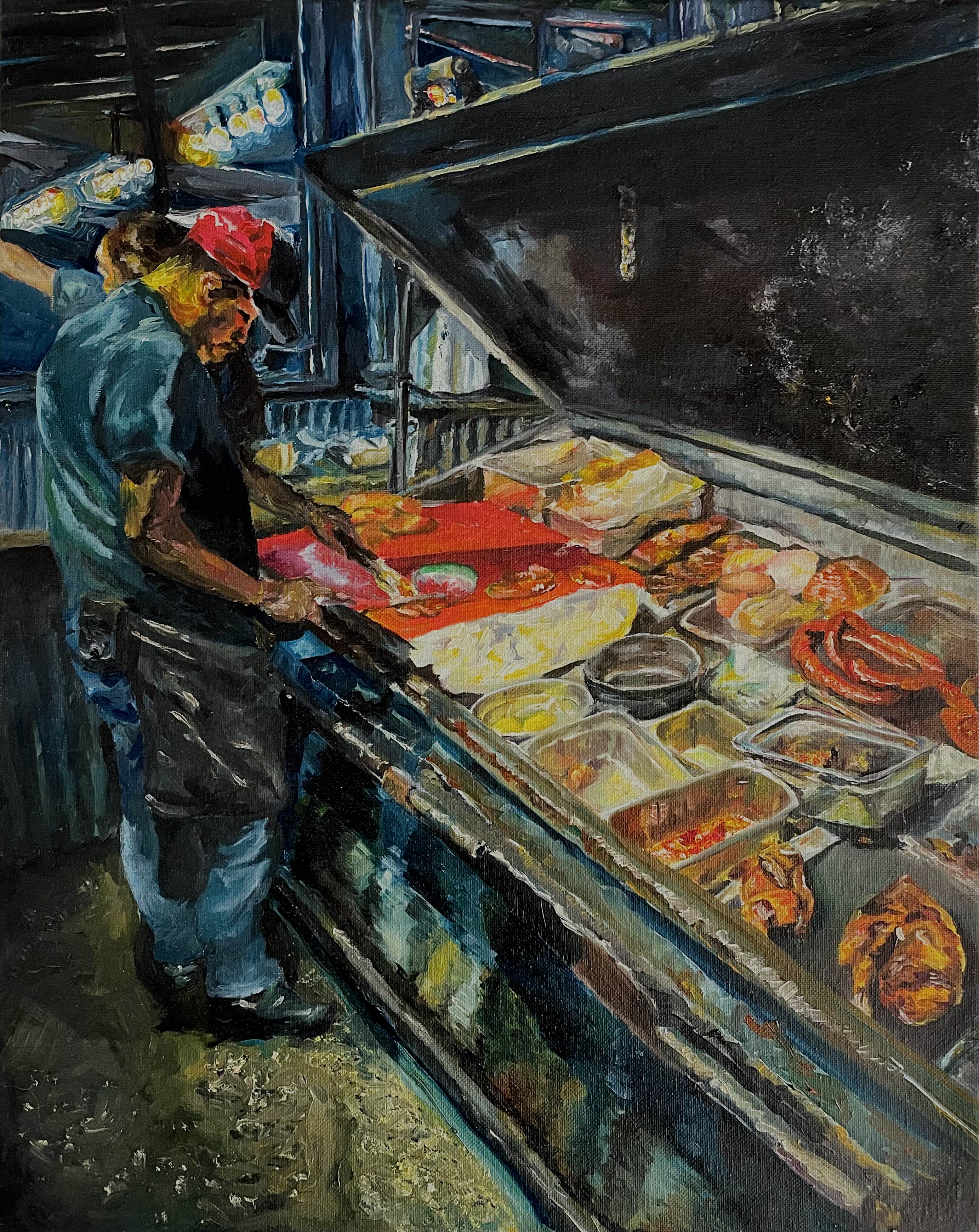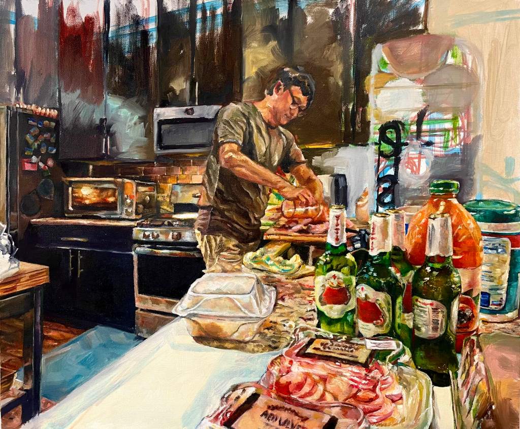 In a Russian realism style, my painting uses cold colors for the setting to emphasize the warm colors of the BBQ on the grill, bringing the BBQ’s tangy smells and heartwarming emotions to life— a testament to the American spirit of staying optimistic and never giving up, regardless of the difficulties that may lie ahead.